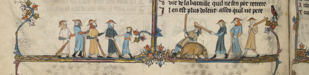 For example, a manuscript from the 14th century, The Romance of Alexander,30 includes illustrations, in the margins, of the daily customs, work, dress, leisure activities, and social norms that existed in Medieval Europe at that time. Of interest, one border illustration shows how individuals with visual impairments were paraded before communities as a form of entertainment at times of festival (Fig. 17), similar to Bruegel’s The Cripples (Fig. 4). Writings from 1425 describe a similar event: