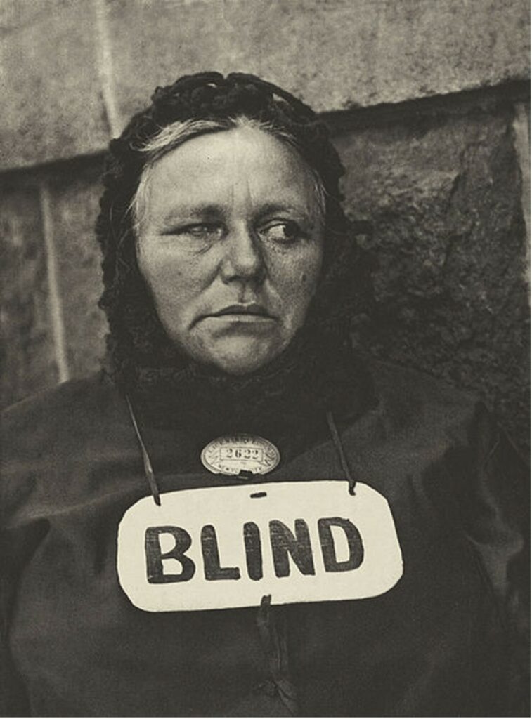 Throughout history, images of the blind beggar have rendered public perception of blind individuals as helpless, useless, and passively dependent. Given the social, vocational, and financial difficulties associated with blindness and marginalization, some blind individuals have succumbed to accepting this role. For example, Millais (1856) portrayed a young blind girl relegated to beg for money by playing her concertina while wearing a sign on her neck displaying the words, “Pity the Blind” (Fig. 18). This was also depicted in a notorious photograph by Strand in 1916 of an impoverished blind woman in New York City, identifying her disability with a sign around her neck saying “Blind,” below the metallic license she needed to obtain to legally beg31 (Fig. 19).